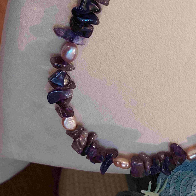 این گردنبند زیبا ساخته شده از سنگ نامنظم آونتورین بنفش و مروارید نامنظم پوست پیازی اصل میباشد.