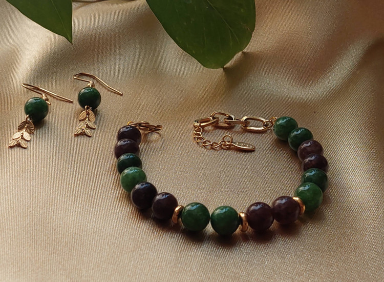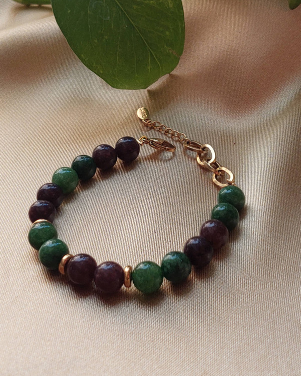 این دستبند تشکیل شده از ترکیب سنگ عقیق سبز و قهوه ای همراه با متریال استیل رنگ ثابت.