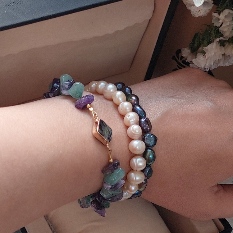 دستبند ترکیبی ،آونتورین و آمیتیست و مروارید با پلاک صدف.
