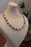 این گردنبند زیبا و فاخر کاری دست ساز از گالری ماه خاتون است ، که درست شده با مروارید اصل و سنگ فیروزه آفریقایی، با قفل و حلقه استیل میباشد. طول حلقه گردنبند با احتساب زنجیر سایزر ۴۲ سانتیمتر میباشد.