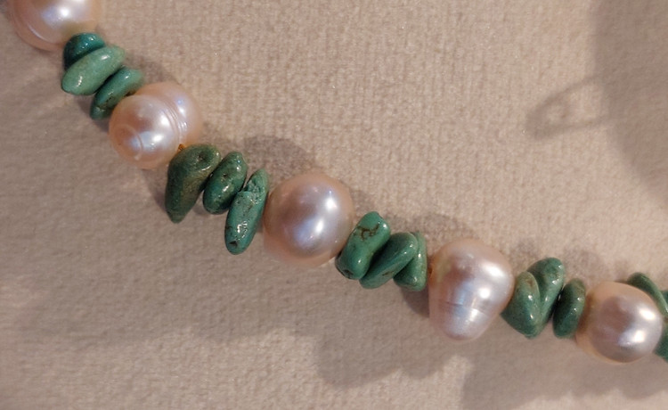 در ساخت این کار از مروارید های دفرمه و نامنظم و سنگهای فیروزه نامنظم استفاده شده که زیبایی خیره کننده ای را به گردنبند بخشیده و حس طبیعی بودن را به بیننده القا میکند.