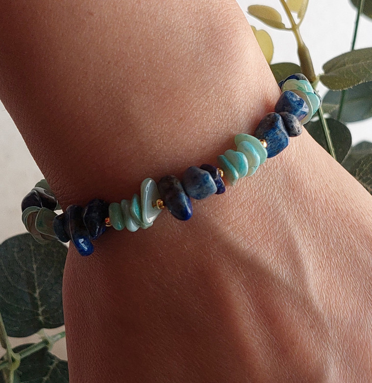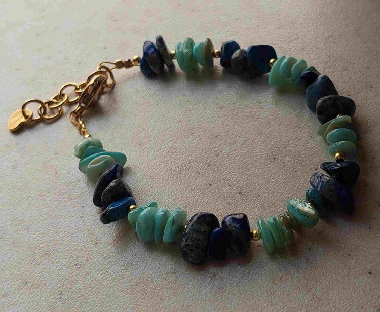 این دستبند زیبا ساخته شده از سنگ لاجورد اصل و صدف های نامنظم رنگ آمیزی شده به رنگ آبی آسمانی است. ترکیب دو طیف زیبای آبی در این دستبند این محصول دستساز را تبدیل به دستبندی خاص کرده است.