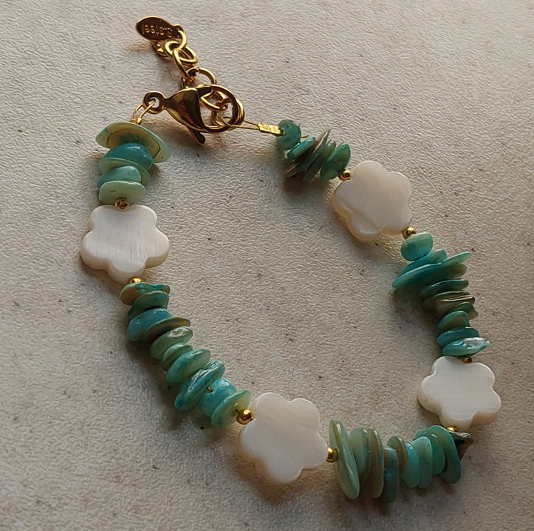 این دستبند ترکیبی است از صدف رنگ آمیزی شده به رنگ آبی آسمانی و فیروزه ای و صدف سفید پنج پر که قطعه ای از طبیعت را به دستان شما هدیه میدهد.